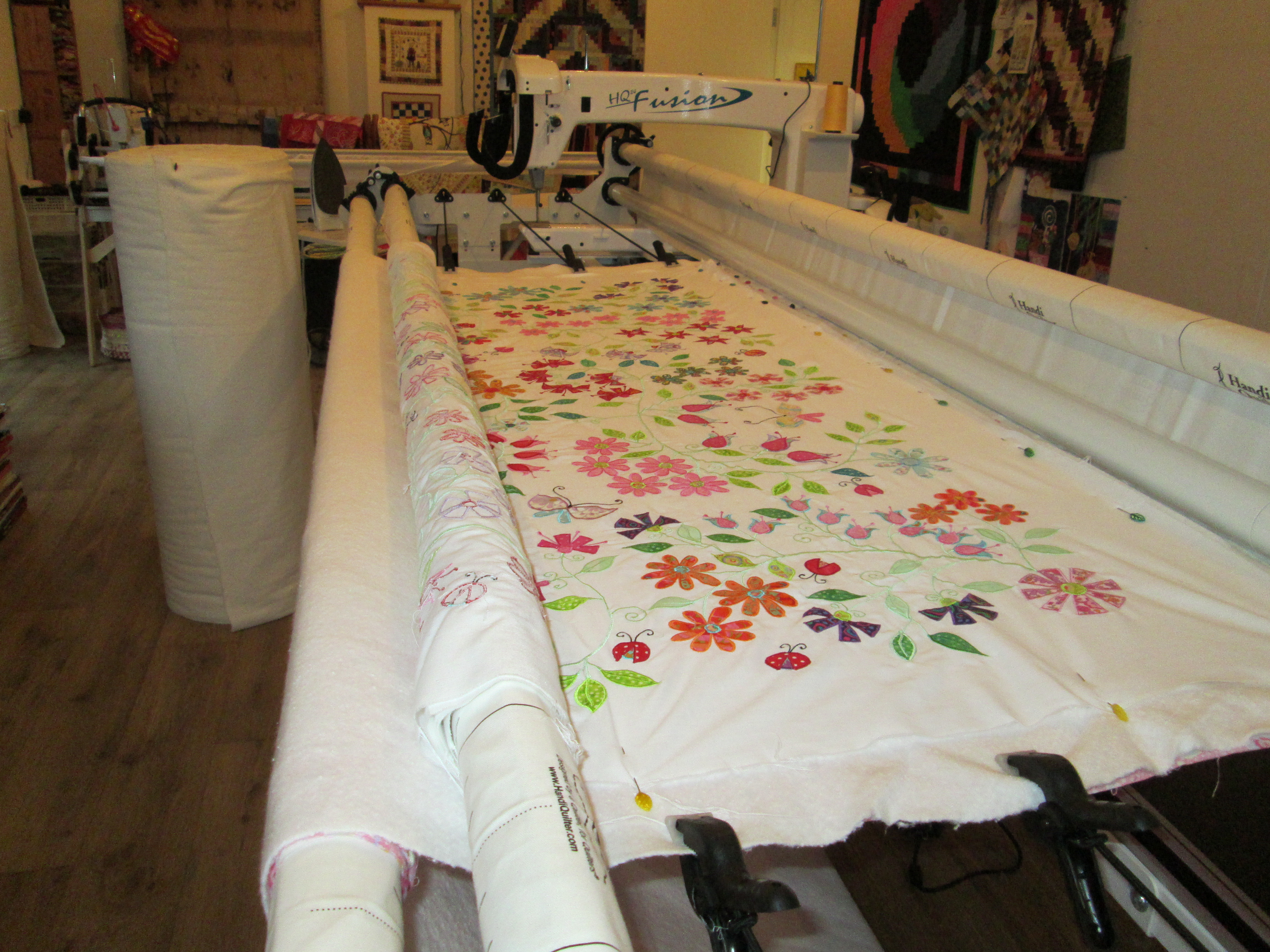 This quilt ,a design by Kellie Wulfsohn, is the quilt that made me really want to take the next step from mid – arm quilting, I spent months machine appliqueing and embroidering the flowers, leaves and stems on to the background. There was no way with the limited space on the mid – arm was going to be able to quilt around all the flowers and stems I also did not want to go back to quilting it on my domestic machine.