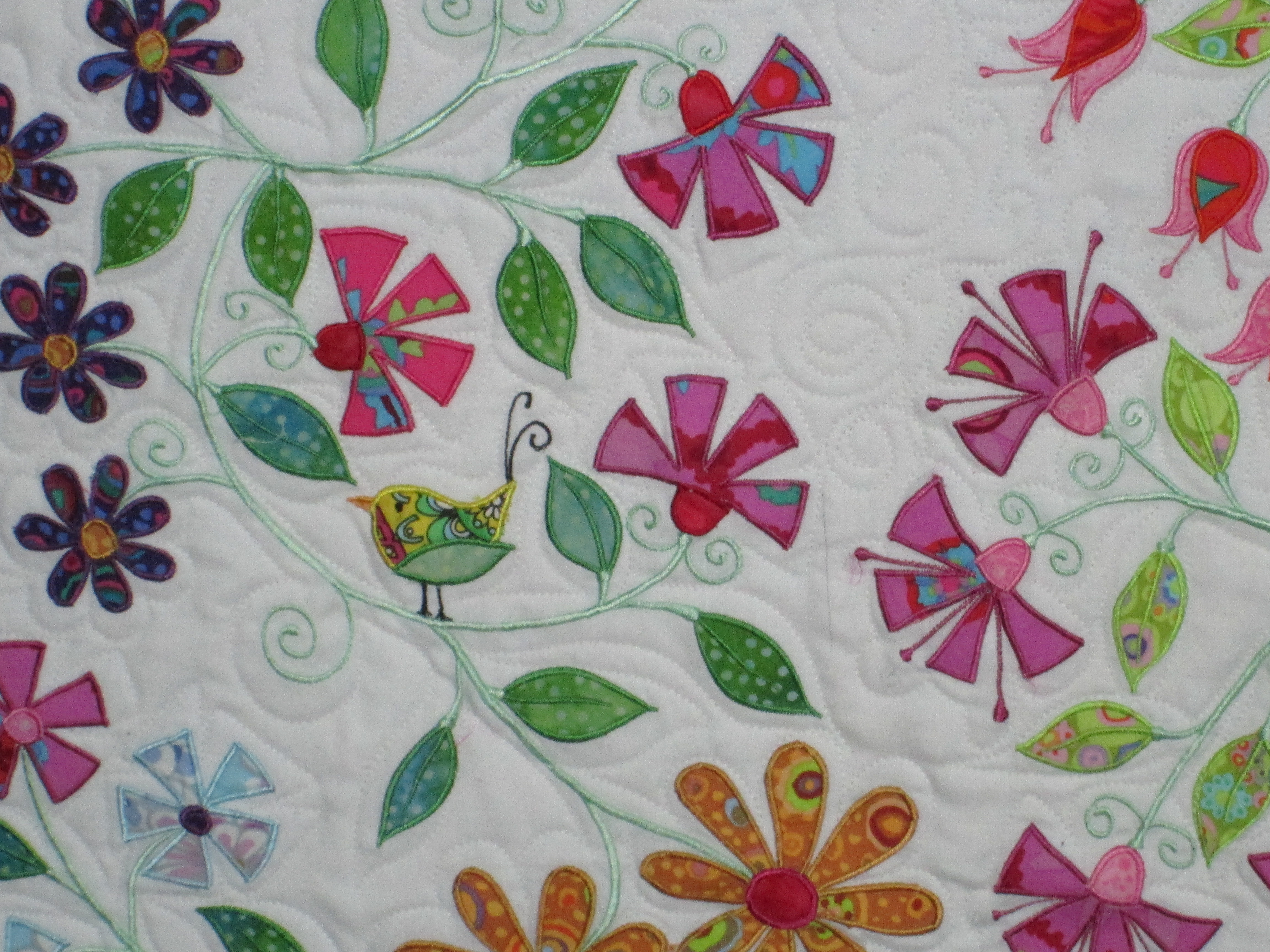 I used nice bright white batting as the white background of the quilt is white muslin and a cream batting would have dulled the white, I did a swirly pattern with bright white thread and outlined the leaves. I was so nervous quilting this top and it took me a long time.