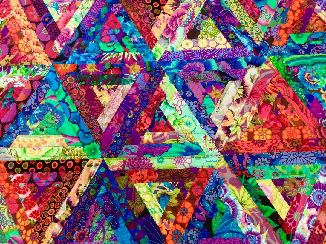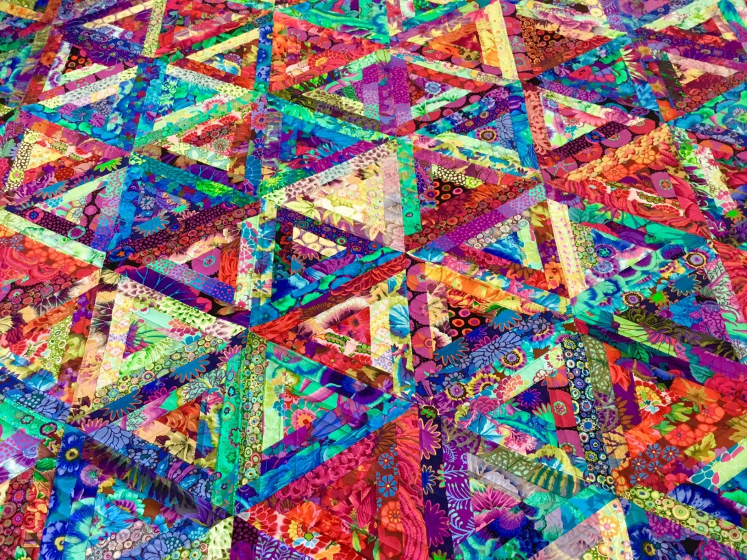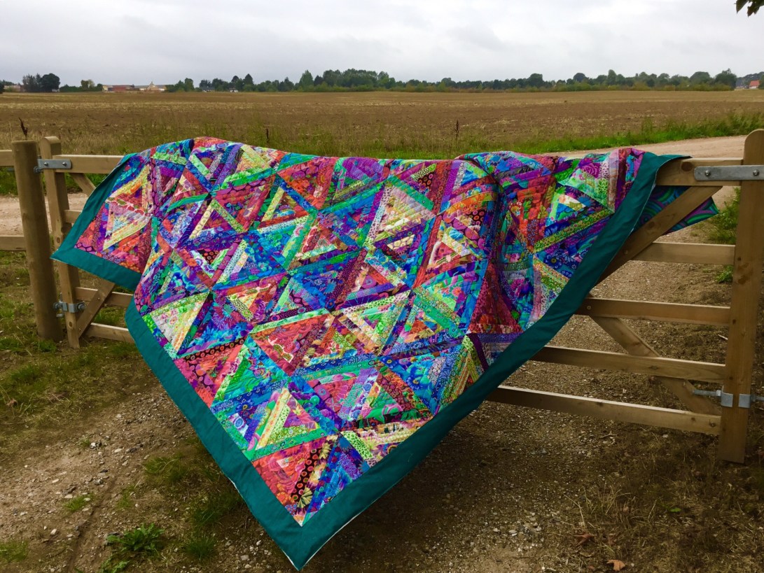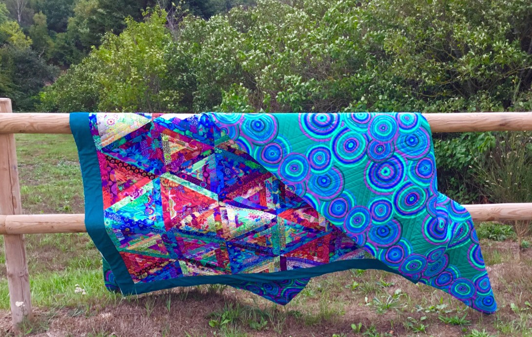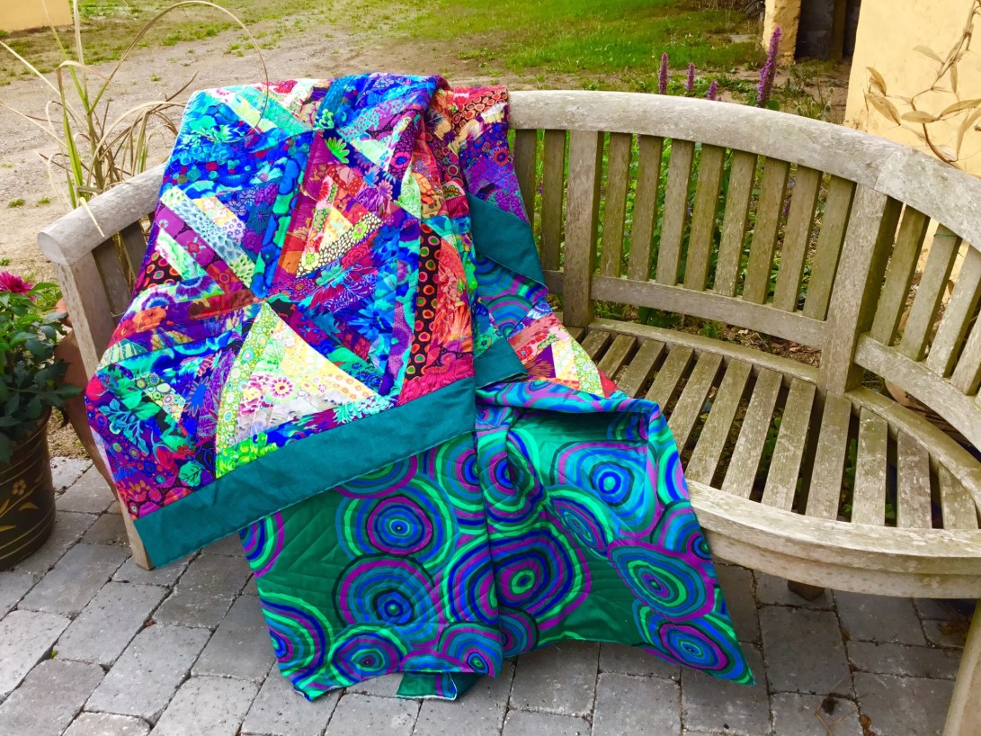 Rita’s super colorful quilt in Kaffe Fasset fabrics.
