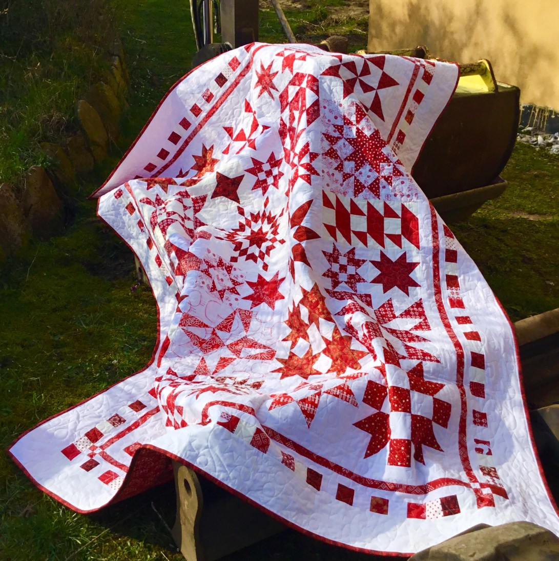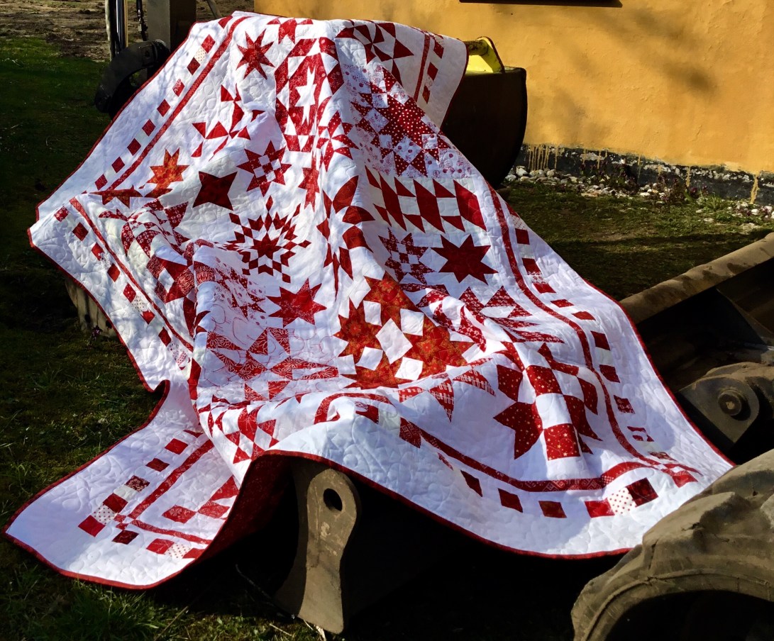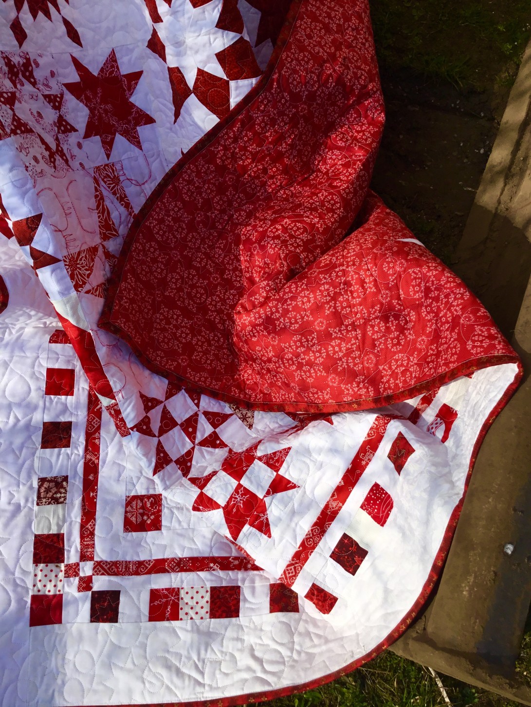 Red on White, the twin to my White on Red quilt, they only took me 2 years to make! This one is pantograph quilted with stars and loops, really simple but effective and it’s super soft, the back is fabric from Helene Juuls shop and I put 3 big white stars just for fun.