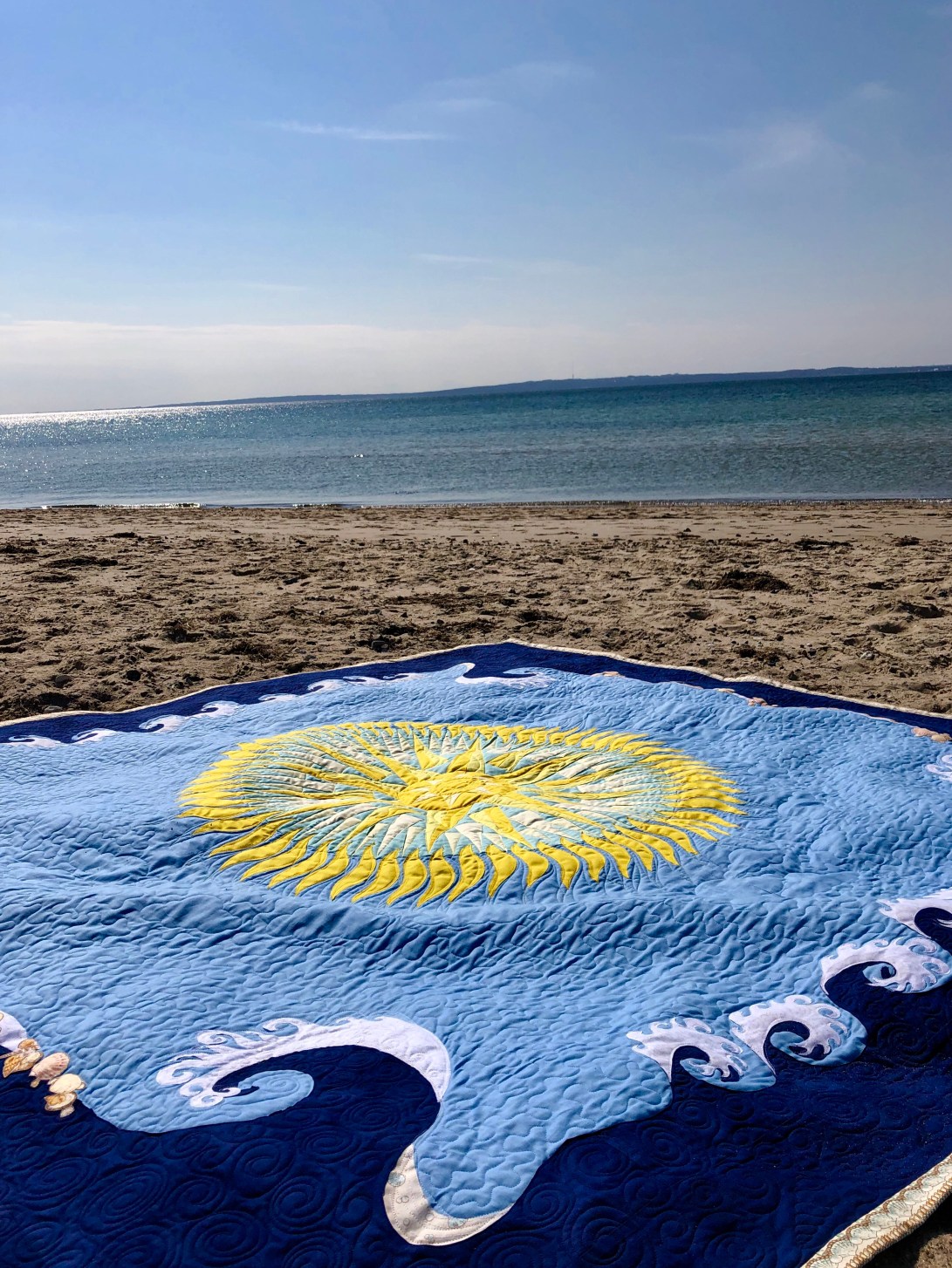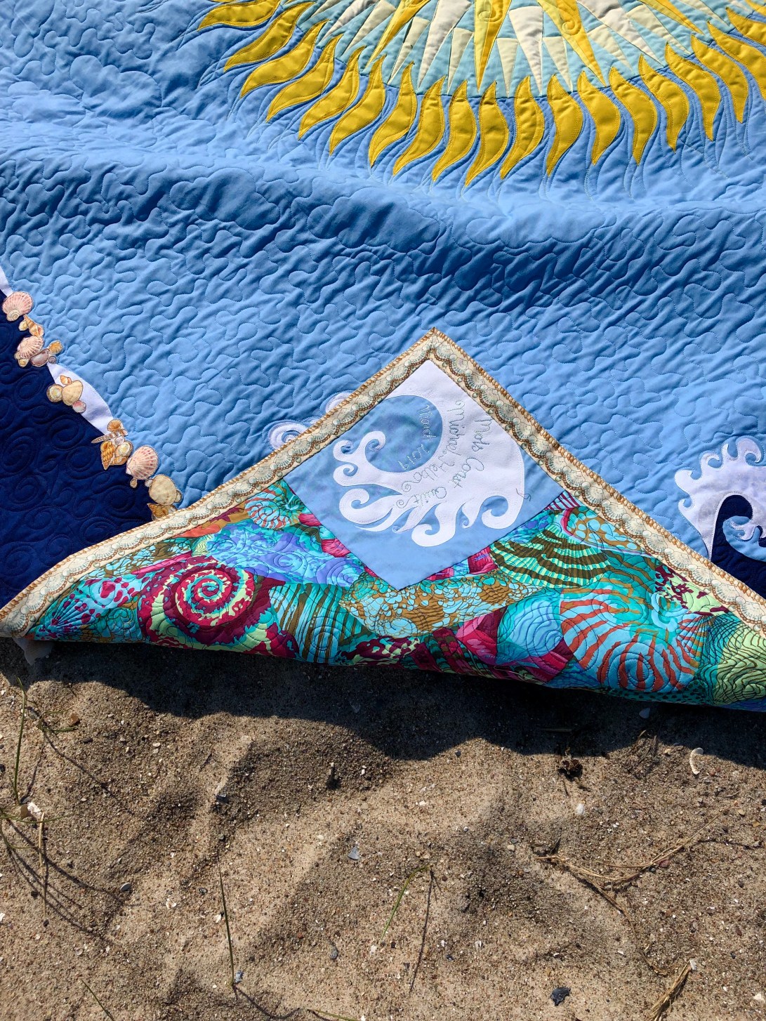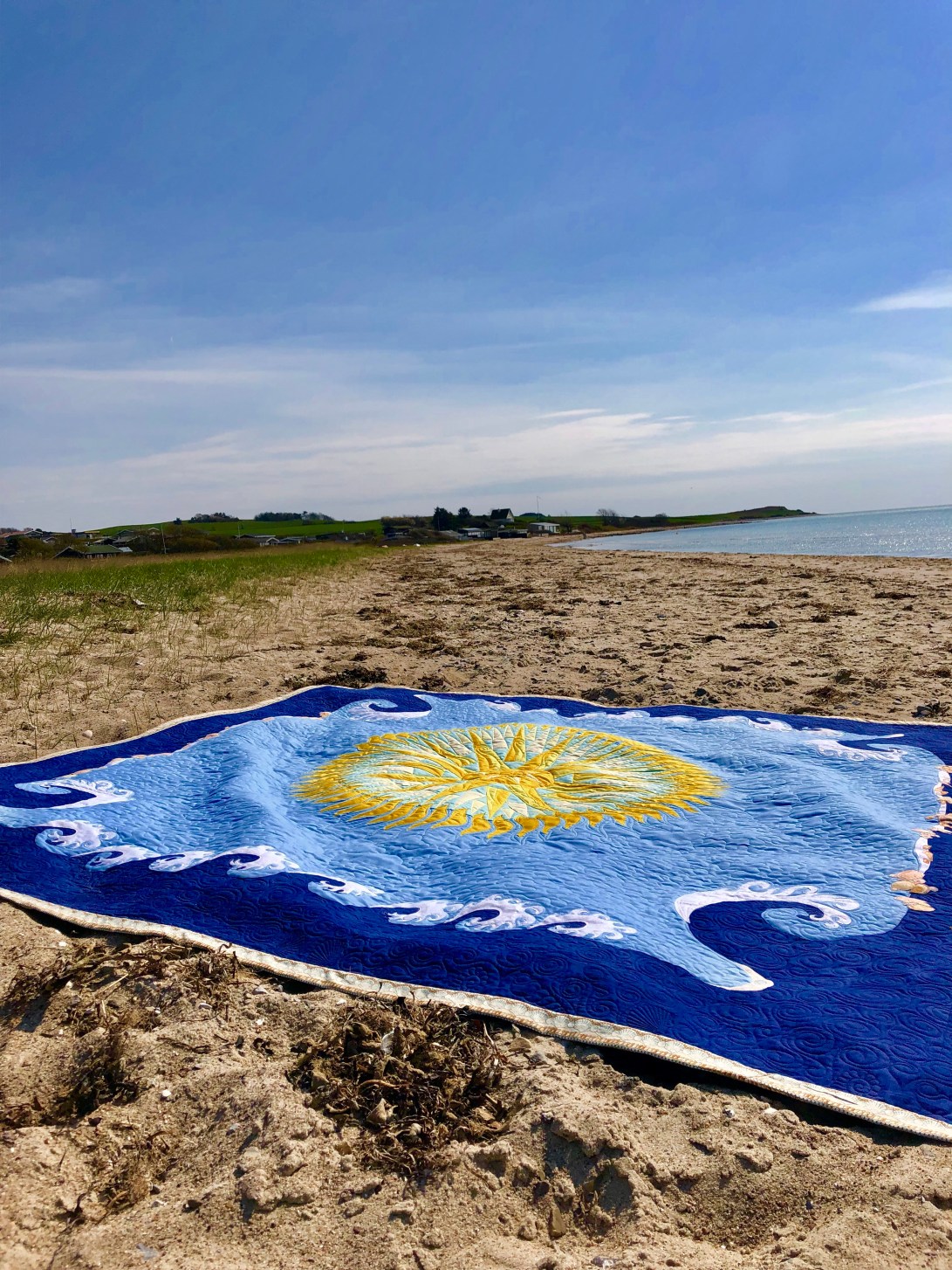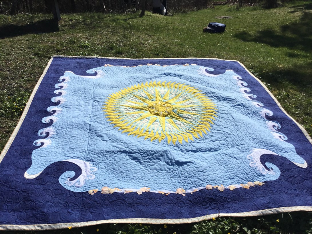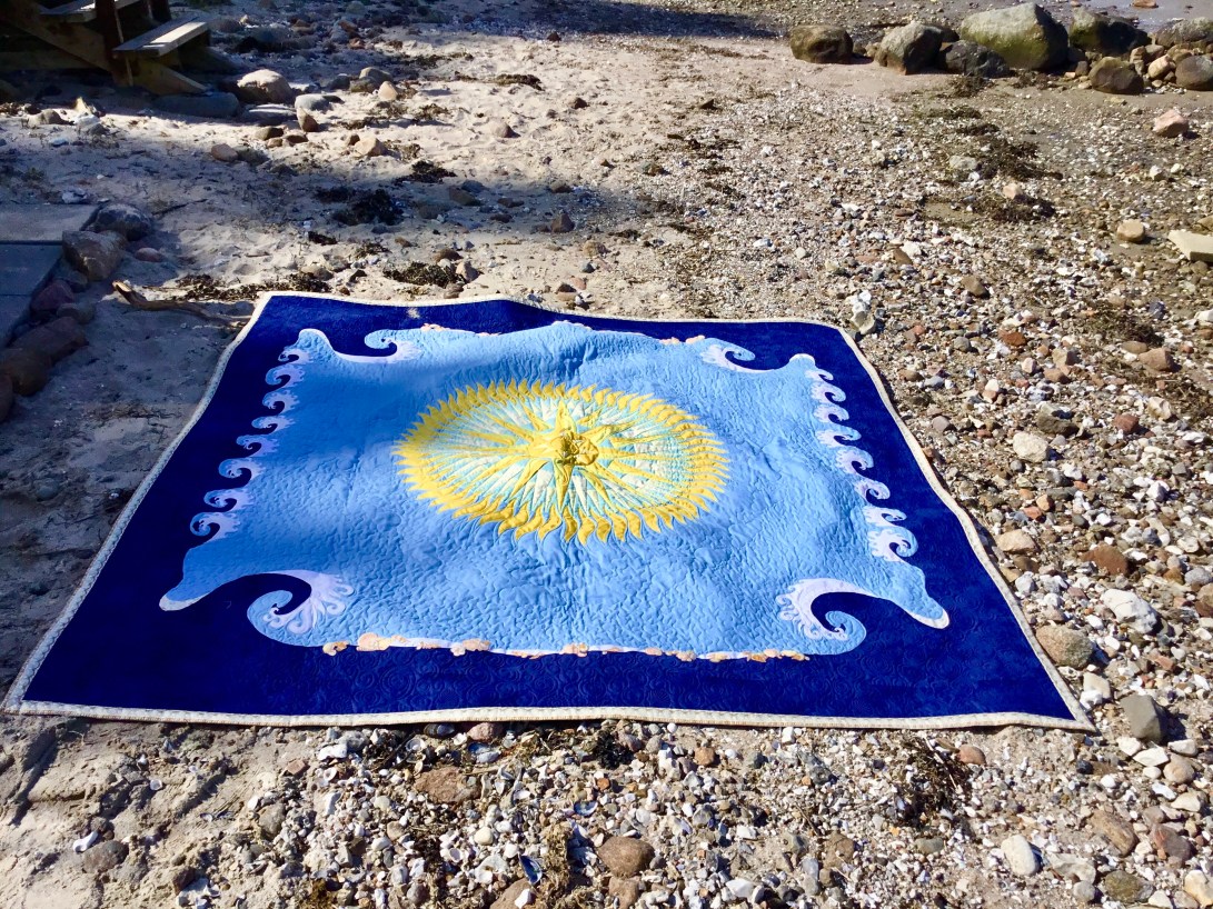 Michael’s summer Mols beach quilt designed by Michael, made by me! The central paper pieced mariners compass has 64 points! The outer waves are hand appliqué and machine appliqué, there shells all over it, in the quilting on the binding and appliquéd on to it. its tough enough for beach use and soft enough to cuddle up with round a beach fire🔥later in the evening.😃🌼😊🇩🇰