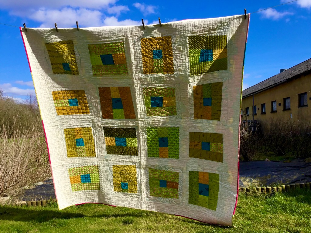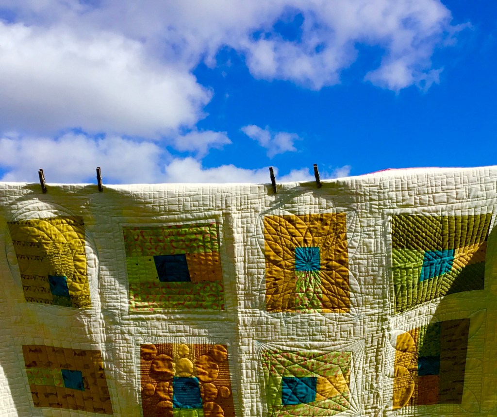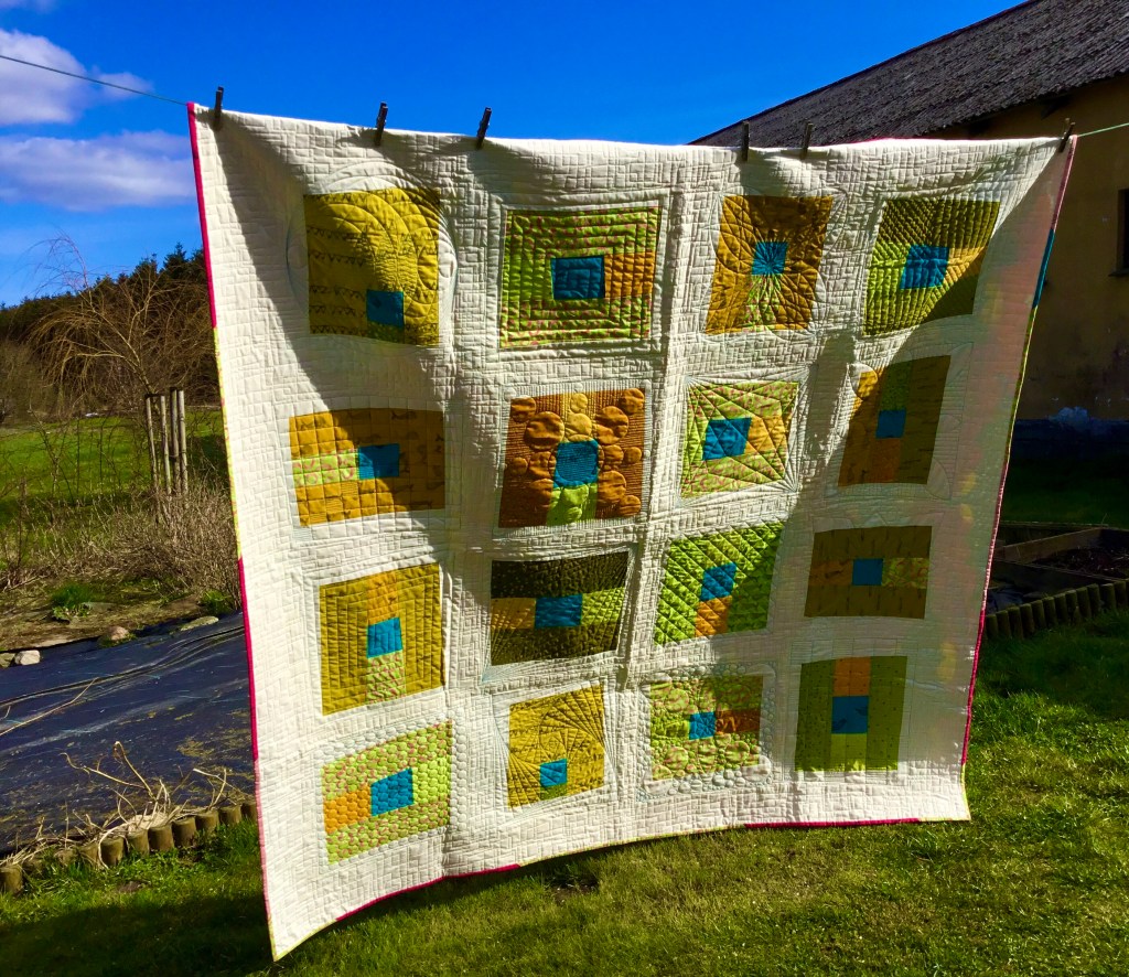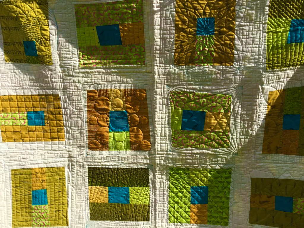 Modern experiments March 22, 2020March 22, 2020 | bunysanders A modern quilt in fresh greens and gold with a splash of turquoise.The quilting thread is cream for the most part but turquoise around the blocks to add depth to them. Share this: Click to share on X (Opens in new window) X Click to share on Facebook (Opens in new window) Facebook Like Loading...