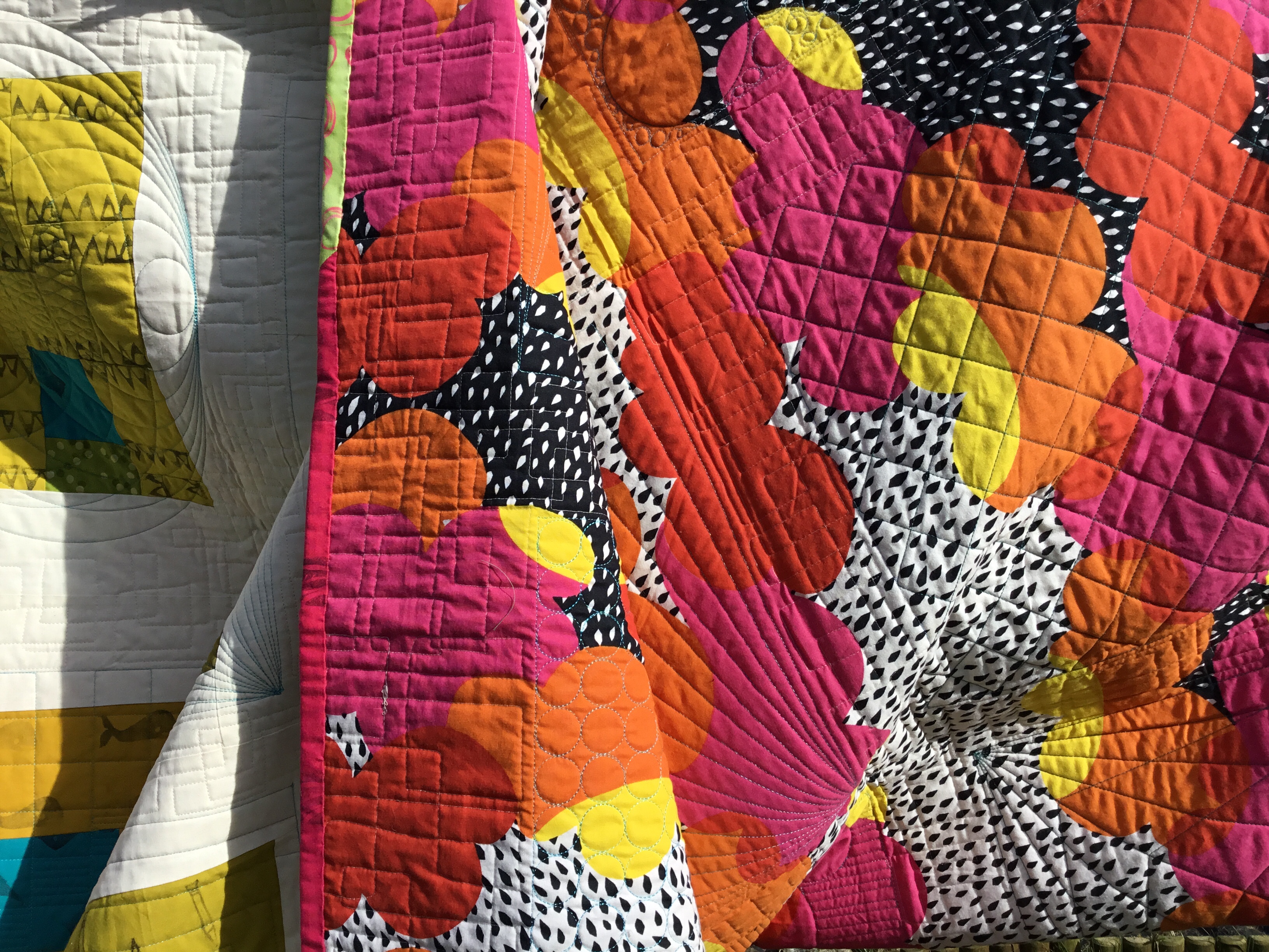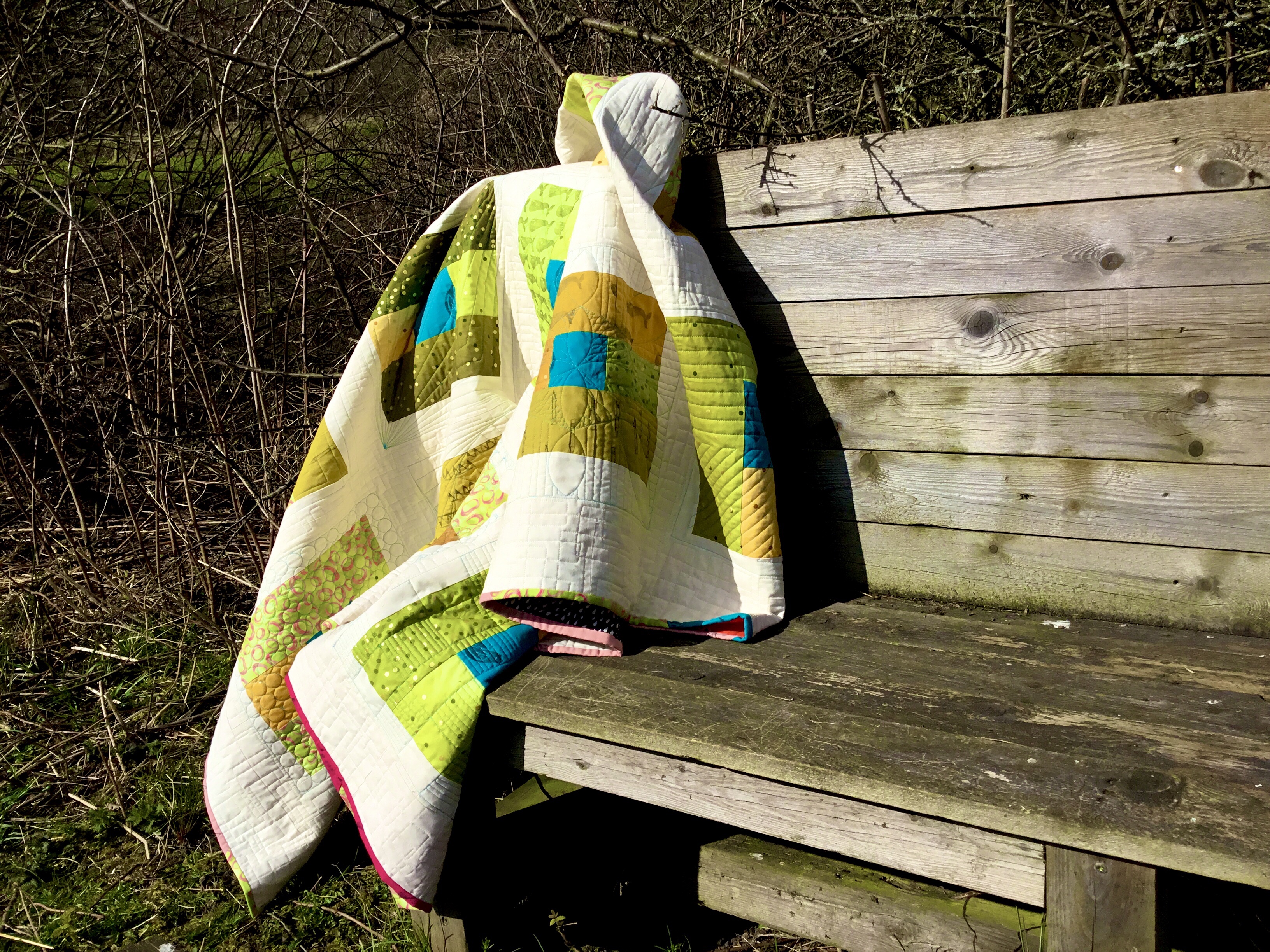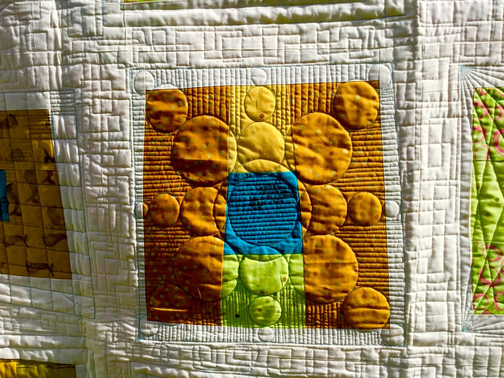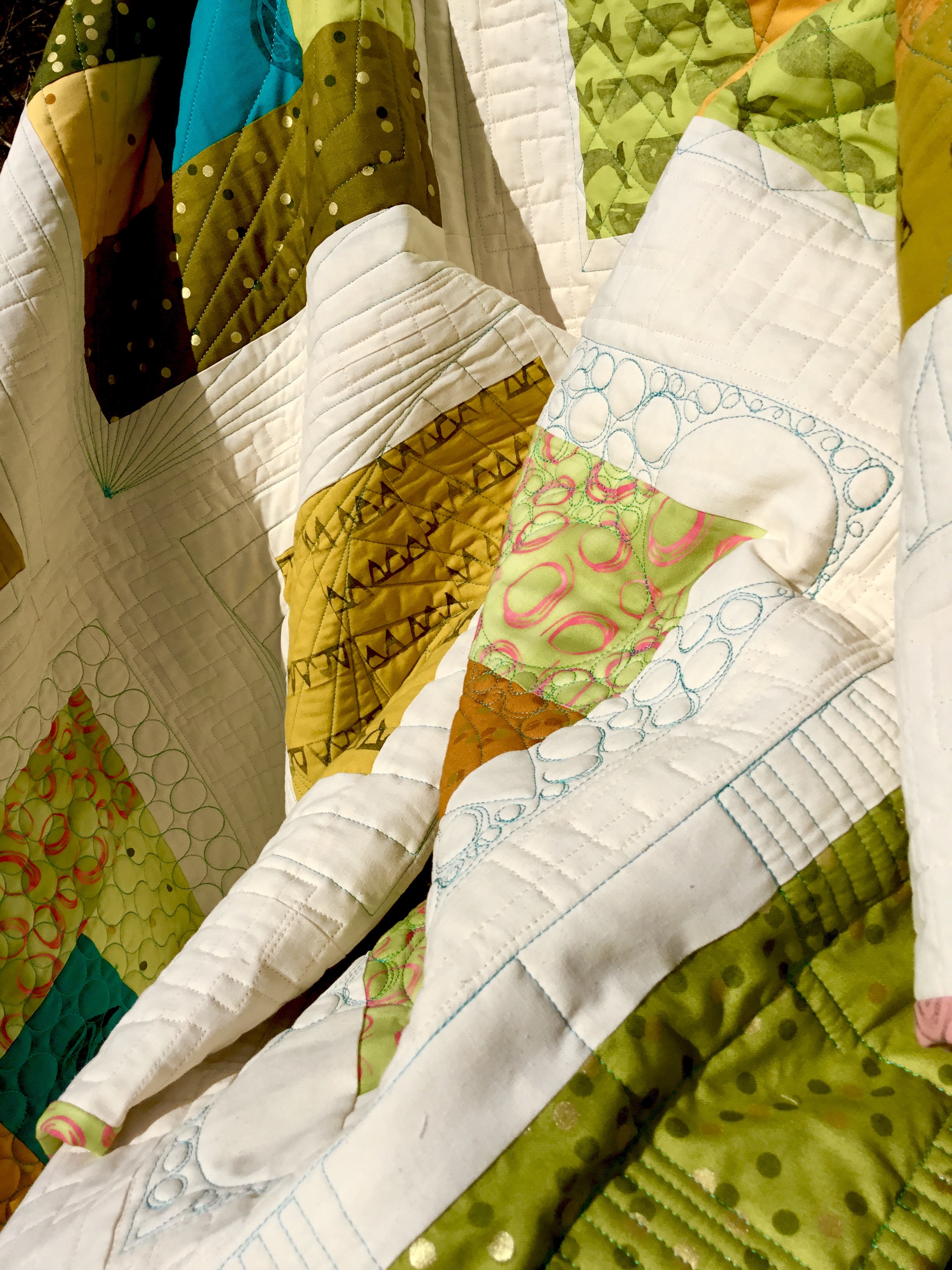 Modern experiments March 22, 2020March 22, 2020 | bunysanders A modern quilt in fresh greens and gold with a splash of turquoise.The quilting thread is cream for the most part but turquoise around the blocks to add depth to them. Share this: Click to share on X (Opens in new window) X Click to share on Facebook (Opens in new window) Facebook Like Loading...