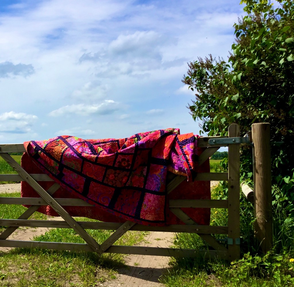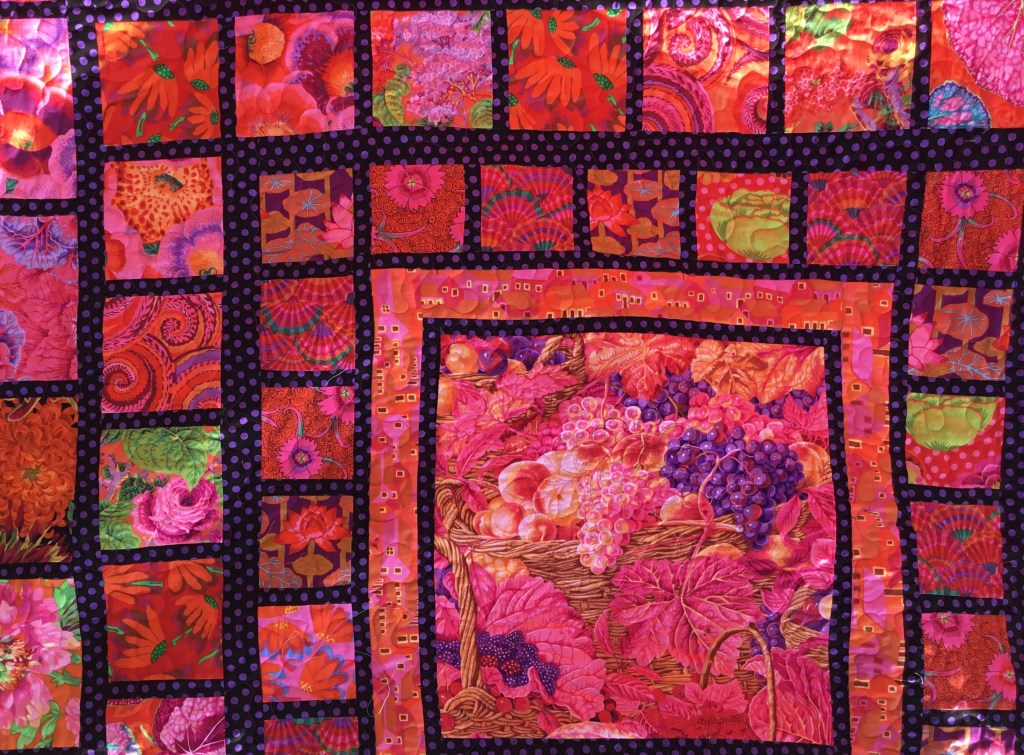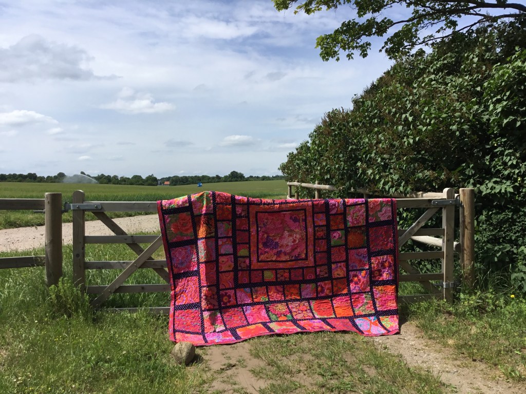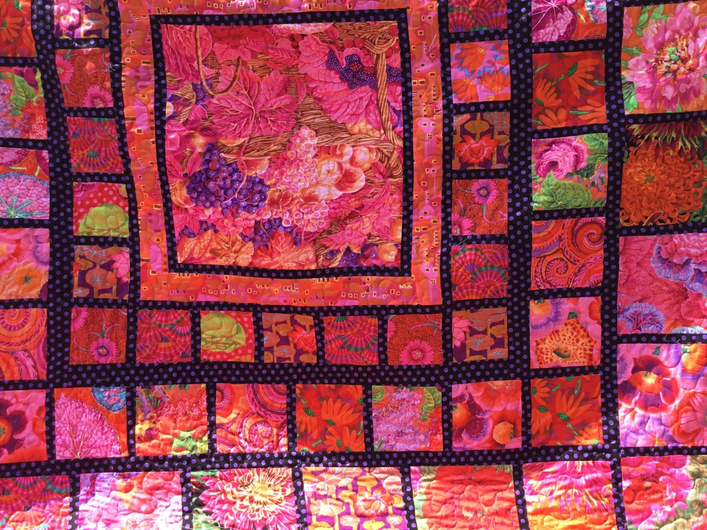Marbritt’s huge Kaffe Fasset inspired quilt.Simply quilted with a meander on the outer blocks, how could I compete with the colours. I used a hot pink thread throughout except for the inner border around the middle panel I used a purple thread.Yes, I know this is inside down, I didn’t notice when taking the photo, what you can’t see in this photos is that I quilted a floral wreath and floral corners on the inner panel.It was so huge it was difficult to keep it off the ground!Right way up!