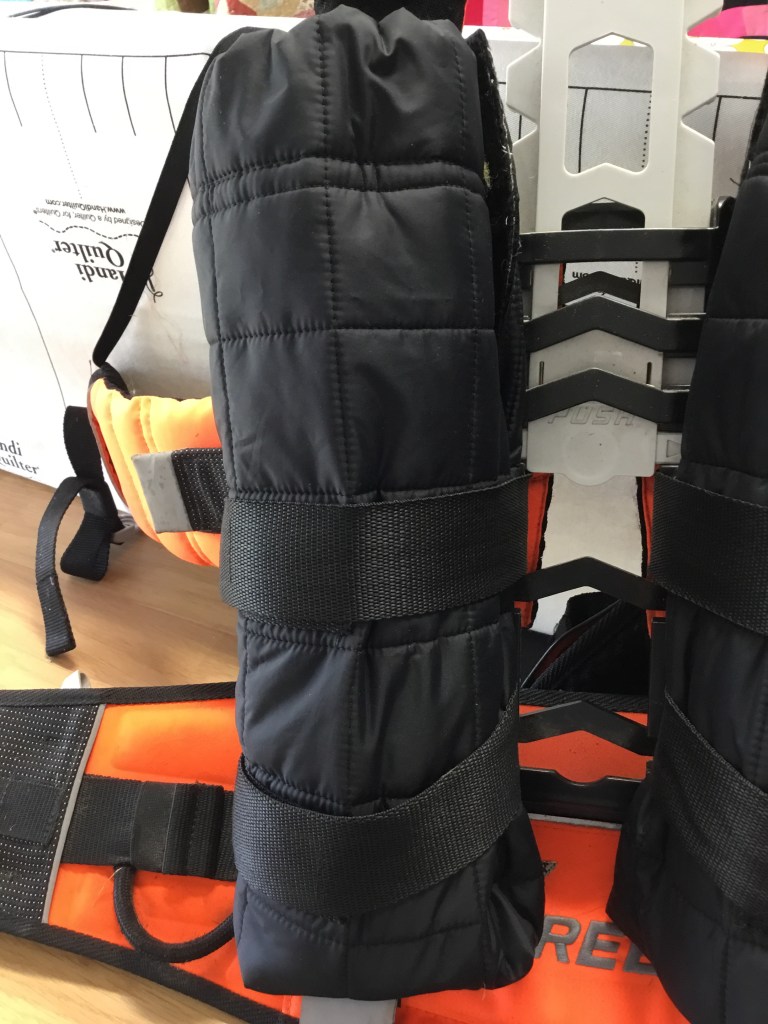 I threaded wide strong elastic through the top and added Velcro to secure the flasks so they will not fall out but are still easily accessible.