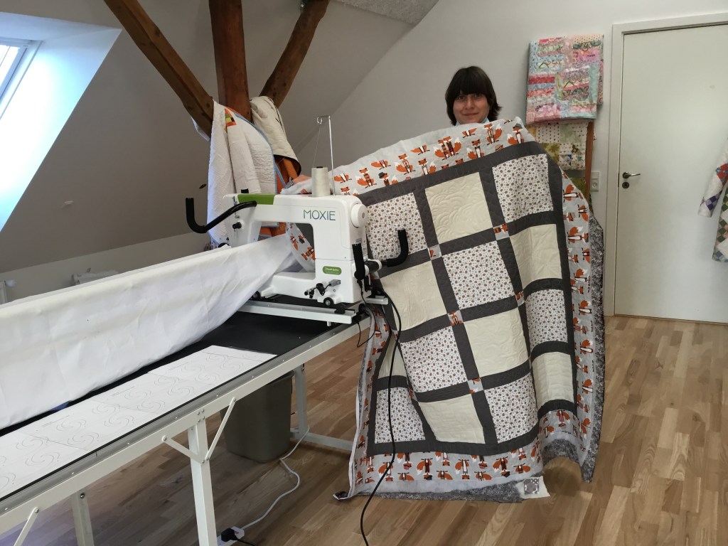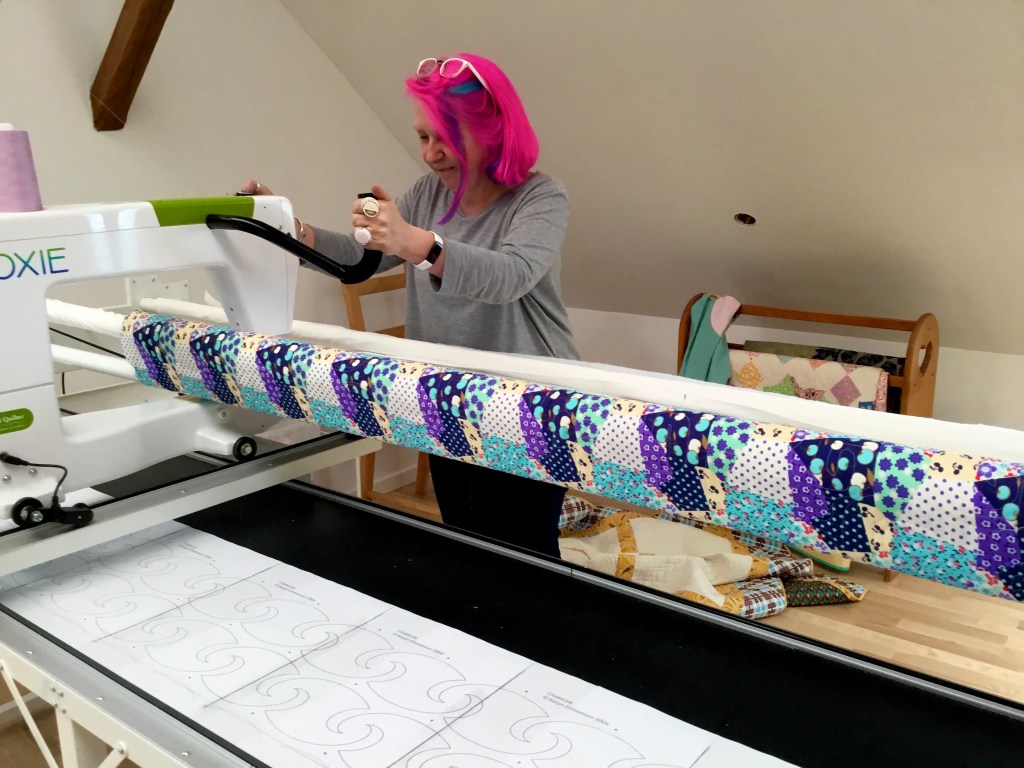 Julia who has never used a Longarm before spent a lovely morning at the studio trying it out, I was very impressed by how quickly she picked it up. Julia used Buttercup on the 10’ frame, the Moxie machines are lightweight ,easy and fun to use, contact me at