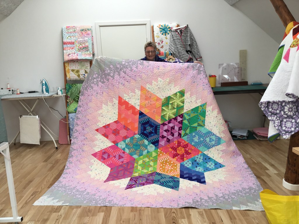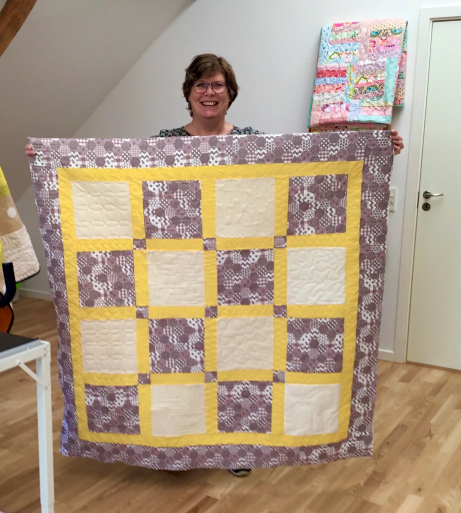 Lene worked with Moxie Buttercup with the 10’ frame.Lene with her finished quilt, well done you did a great job!