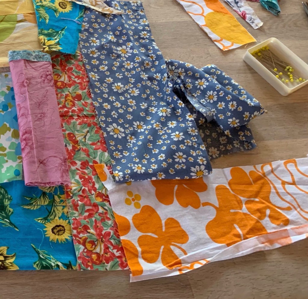 Cut 4 x 6.5″ x 3.5″ rectangles in background fabric and 4 x 3.5″ x 2″ rectangles in gold.