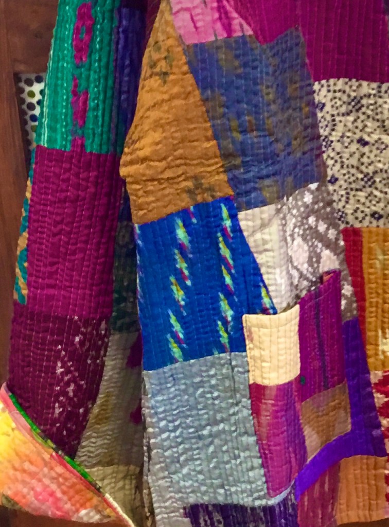 Place a green 3.5” square right sides together on top of the background rectangle and a 2” square the golden rectangle, stitch at the top of the marked line, and press.