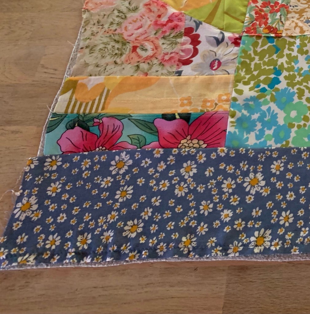Lay out all the pieces as shown using 4 x 2″ gold squares, 1 red 3.5″ square and the 3.5″ x 2″ units.